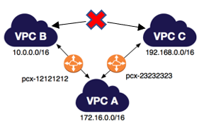 (If VPC A & B have peered and VPC A & C have peered, VPC B & C cannot share contents until there is an exclusive peering done between VPC B & C)